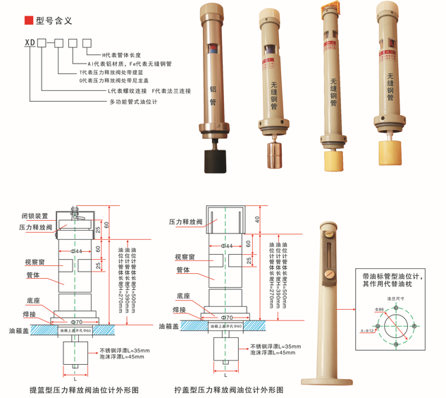 XDL(F)系列油位計(jì)是全密封變壓器專用產(chǎn)品。本產(chǎn)品選用優(yōu)質(zhì)無(wú)縫鋼管或合金鋁制造,外觀靜電噴塑,密封可靠,操作簡(jiǎn)單,安裝方便,縮短工時(shí),具有多項(xiàng)功能,可做注油管連接。