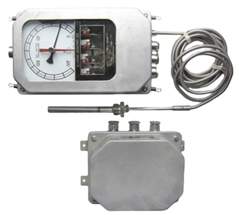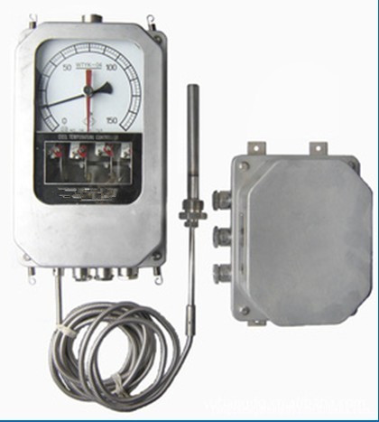 油浸式變壓器溫度控制器是用于測(cè)量電力變壓器內(nèi)變壓器油溫的測(cè)量?jī)x表,儀表采用復(fù)合傳感器技術(shù),即儀表溫包推動(dòng)彈性元件的同時(shí),能同步輸出Pt100熱電阻信號(hào),此信號(hào)可遠(yuǎn)傳到數(shù)百米以外的控制室,通過(guò)XMT系列數(shù)顯溫控儀同步顯示并控制變壓器油溫。也可通過(guò)XMT系列數(shù)顯儀表,將Pt100熱電阻信號(hào)轉(zhuǎn)換成與計(jì)算機(jī)聯(lián)網(wǎng)的直流標(biāo)準(zhǔn)信號(hào)(0~5V、1~5V、4~20mA)輸出。儀表采用外置接線盒方便用戶接線。